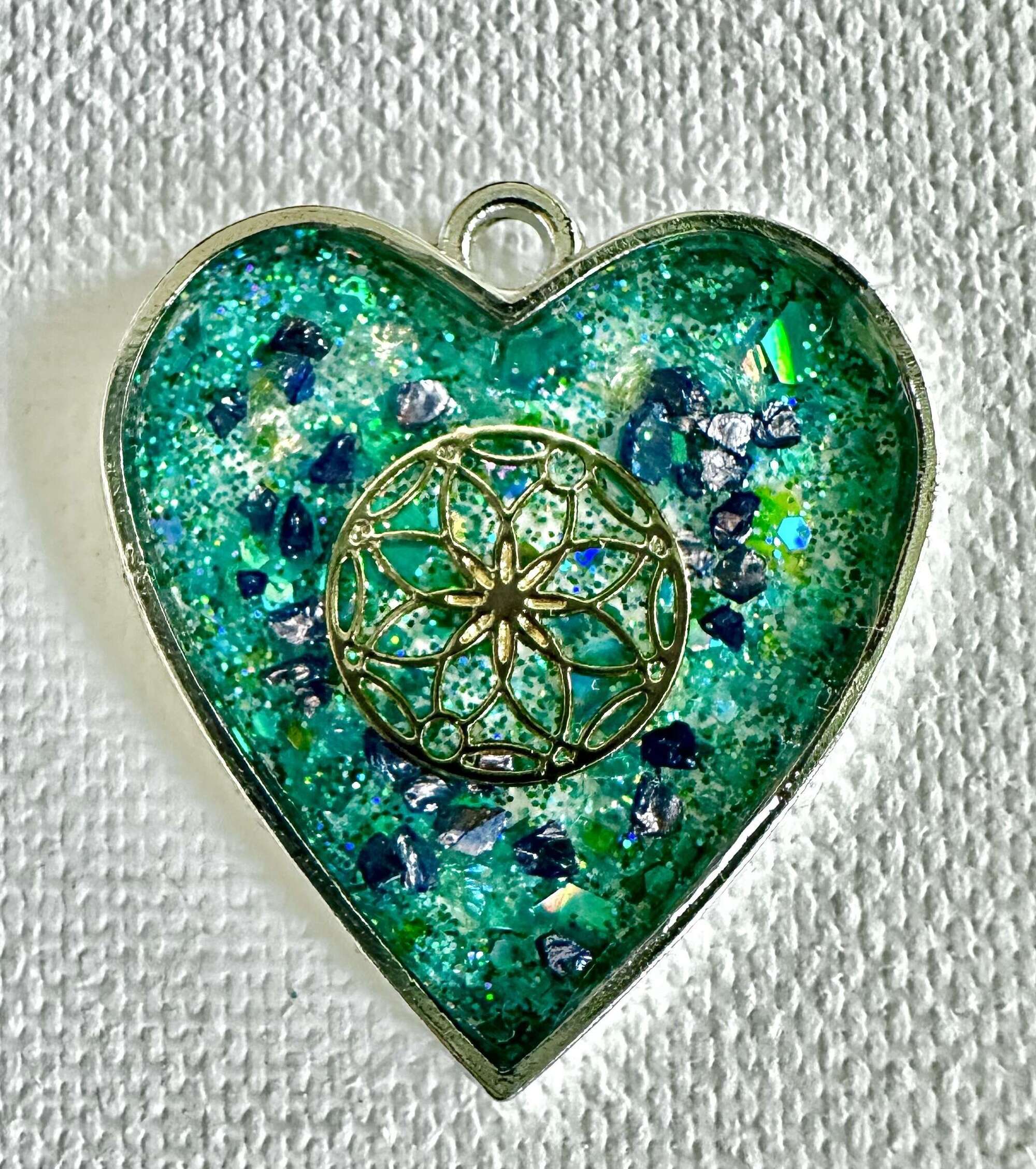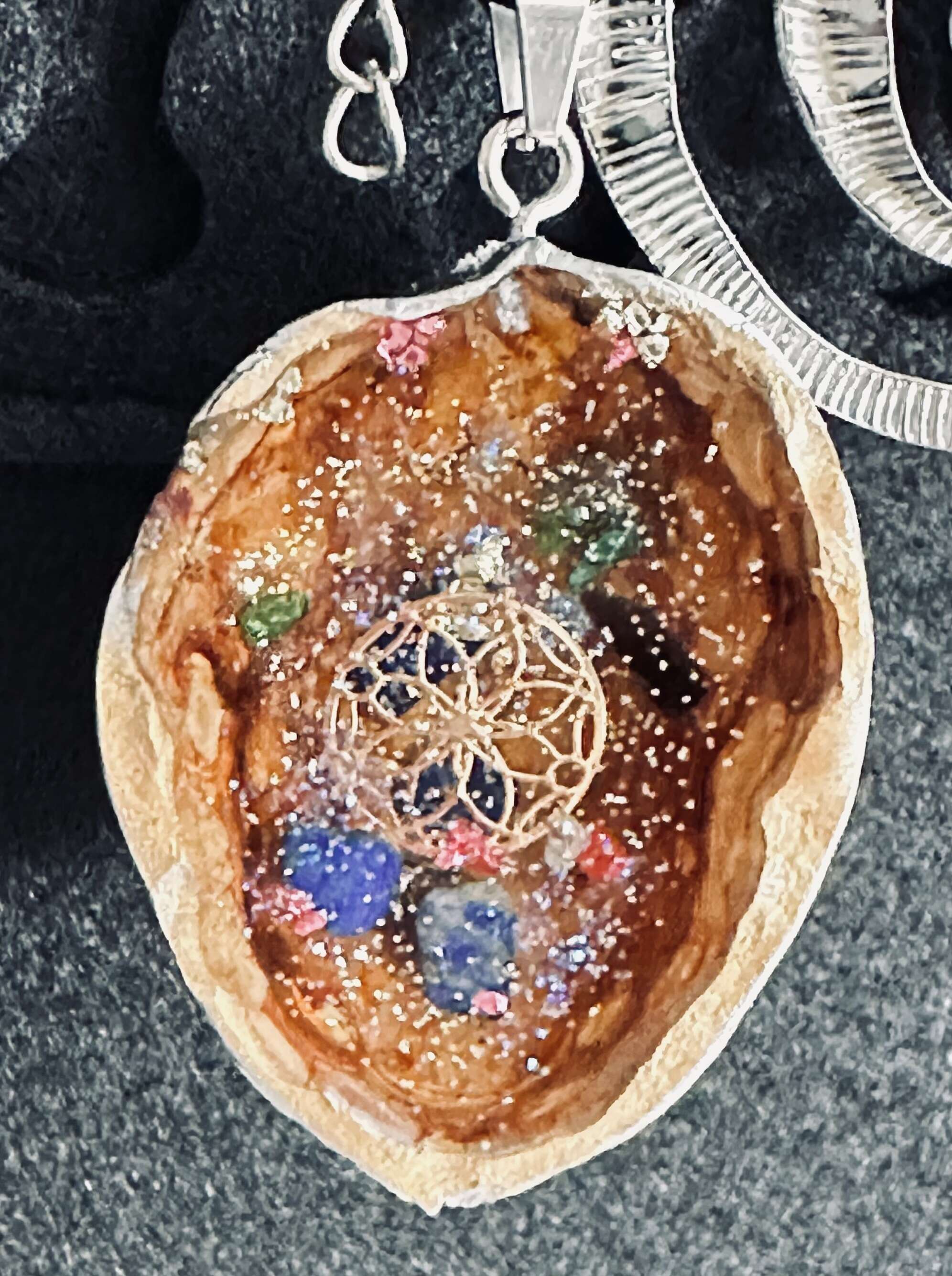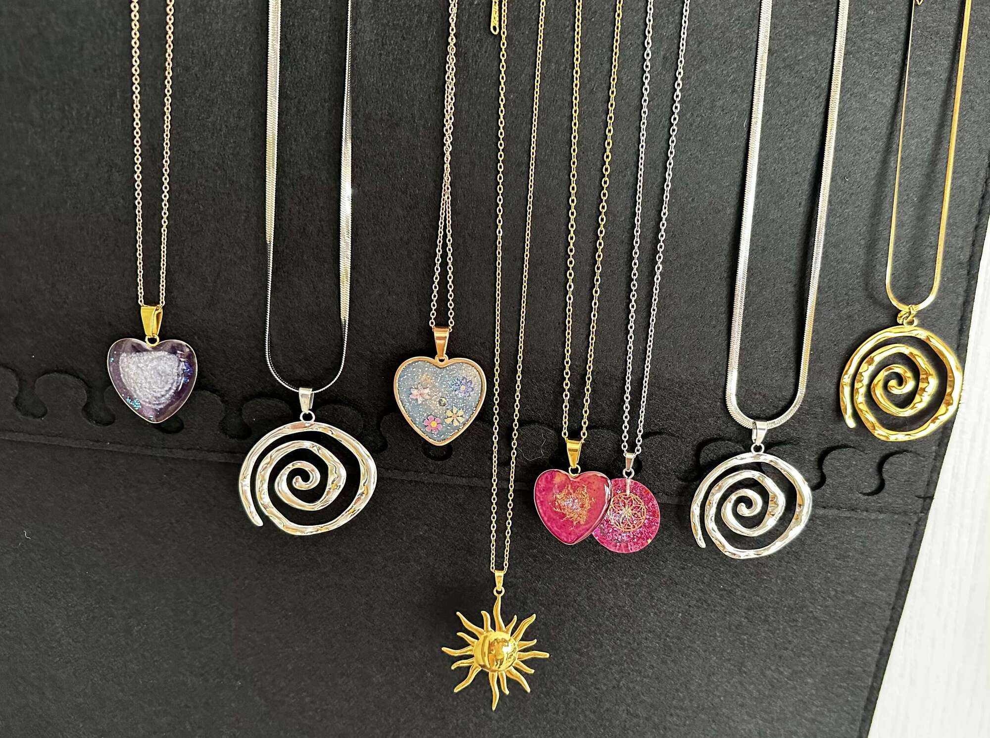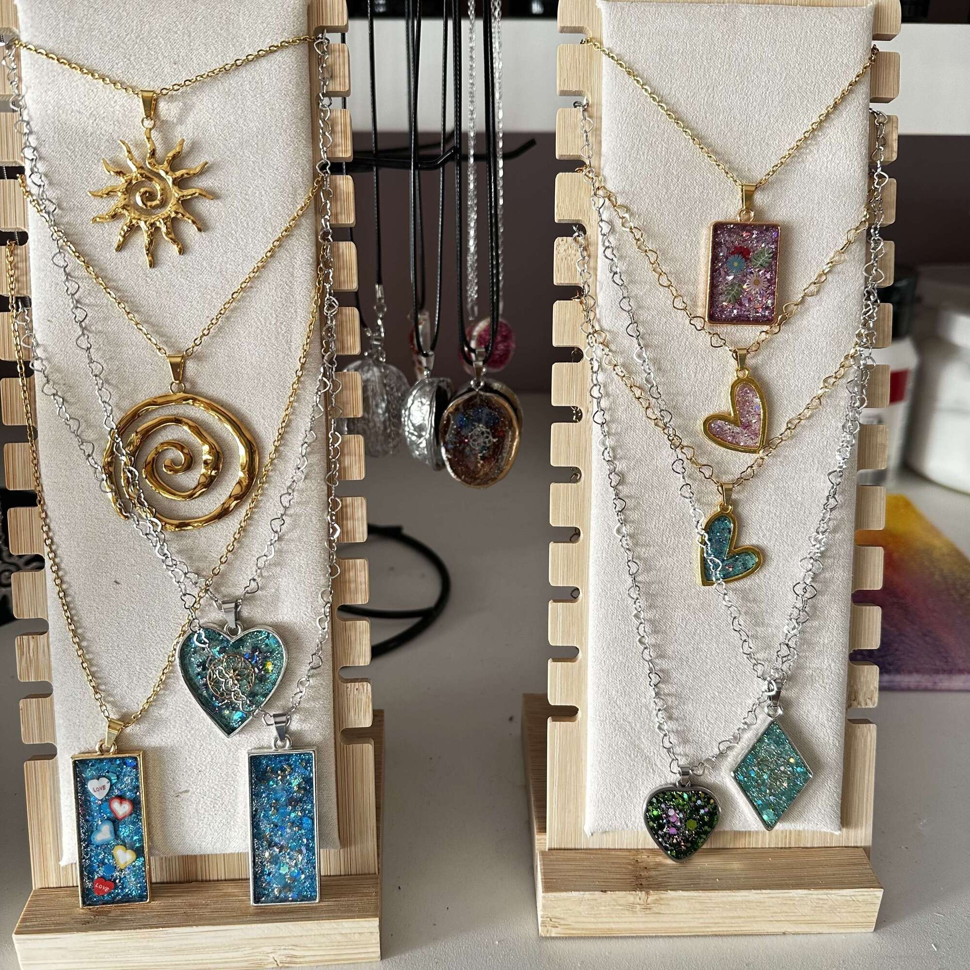Ces créations sont en liens avec l'énergie féminine. Un grand choix de colliers avec chainettes en forme de coeur ou en simple maillon, sur support acier façon or 18 K et argent traité anti-allergène. Avec la résine, j'offre une multitude de couleurs en inclusion avec des cristaux de pierres et poudre de mica, ce qui rend la création unique en y mettant les mêmes intentions que dans mes toiles.